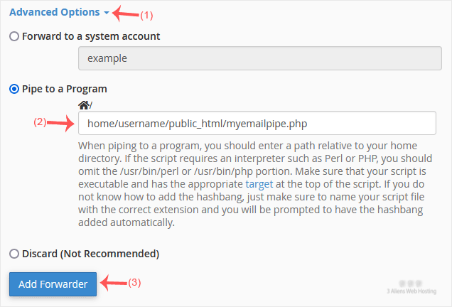 3. In the Destination section, click on Advanced Options, select Pipe to a Program and enter the full path of your pipe script, such as home/username/public_html/myemailpipe.php