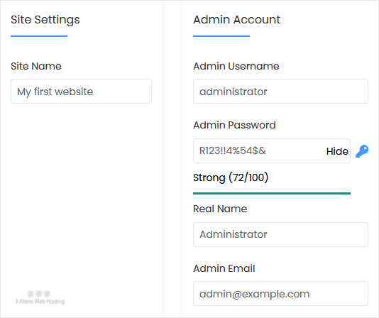 - Admin Username: Your new e107 username (for security reasons, do not use the administrator or the admin username).